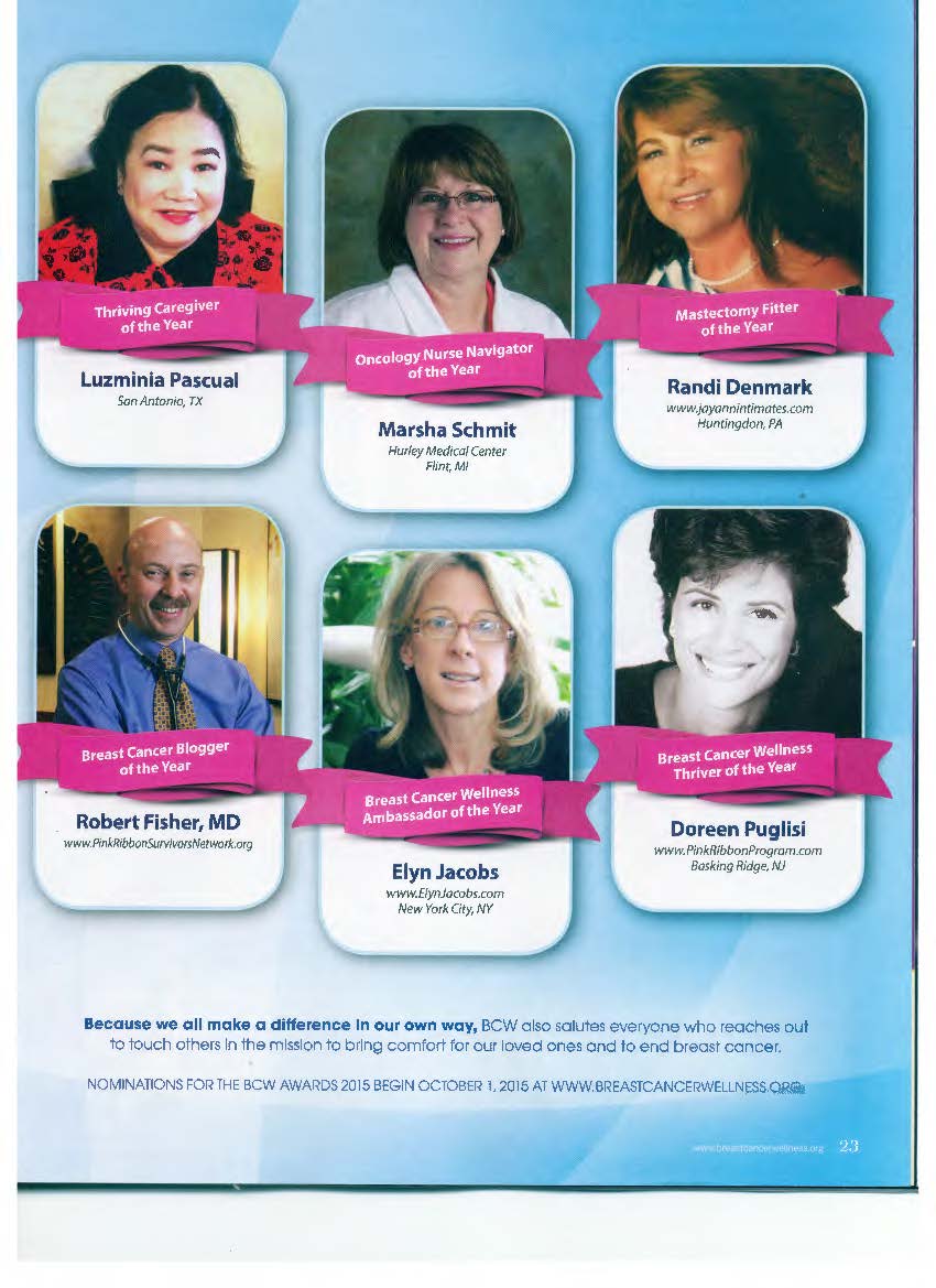 Thank you to all who nominated and voted for me for the Breast Cancer Wellness 2014 Ambassador of the Year Award. I value your appreciation and support for my work.  Blessings to all!  Elyn